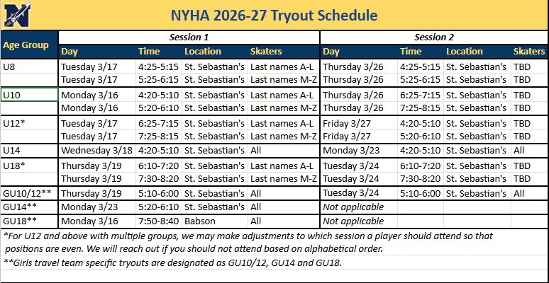 Tryouts will be held the weeks of March 16th and March 23rd. Registration for current NYHA families is now open and will close on Friday March 6th. Links to register your Skater and the *UPDATED* Tryout Schedule can be found below: